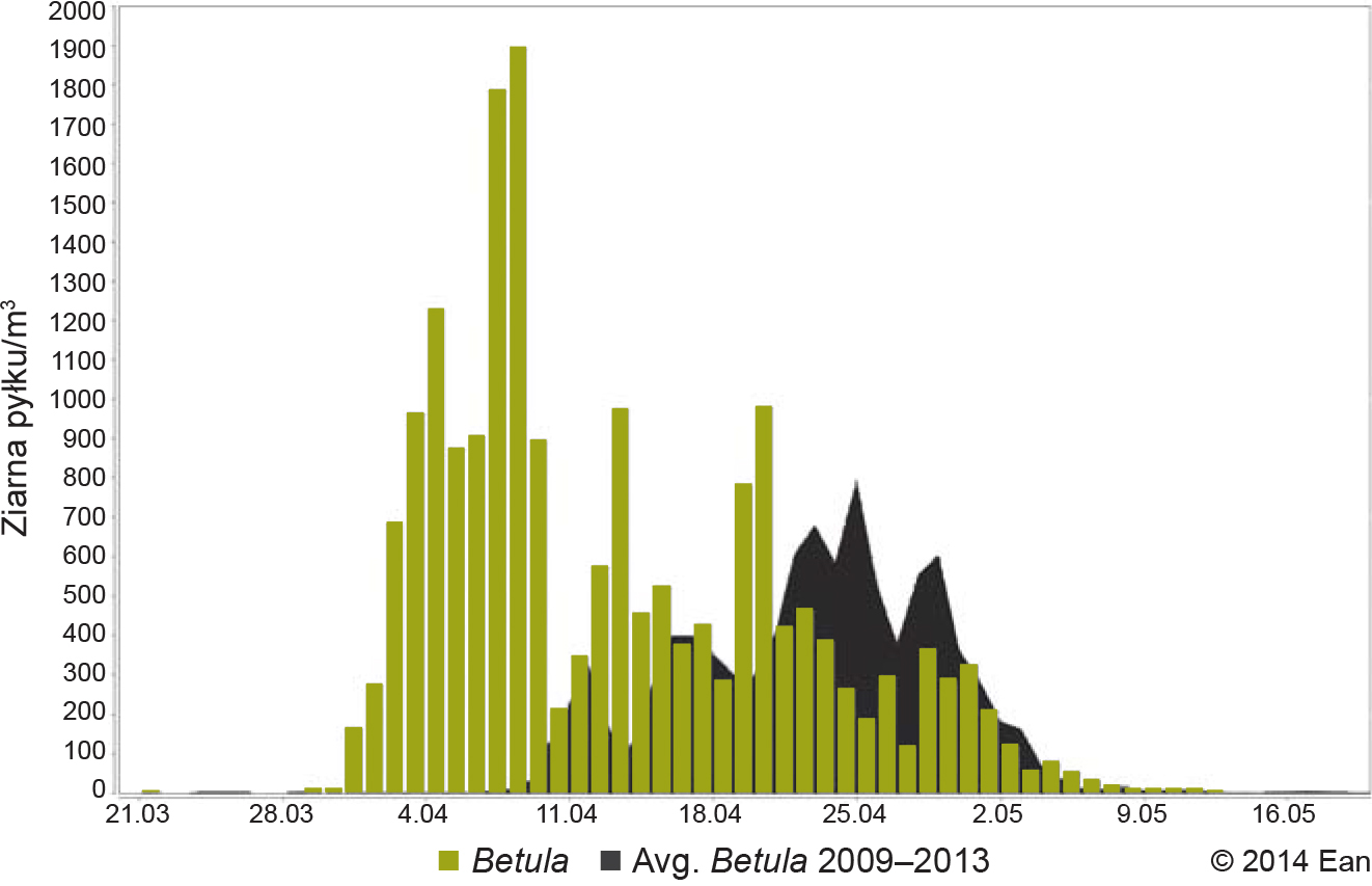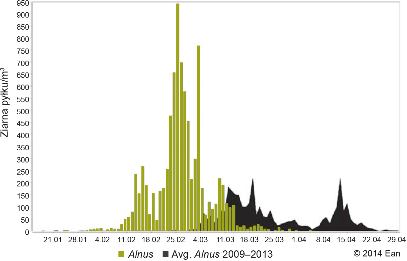 Sezon pylenia leszczyny rozpoczął się 11 stycznia 2014 roku. Przebieg sezonu pylenia olszy w 2014 r. charakteryzował się większą niż w 2013 r. liczbą dni ze stężeniem progowym (32 dni w 2014 r. vs 24 dni w 2013 r.) oraz wyższym sezonowym indeksem pylenia (8594 w 2014 r. vs 5165 w 2013 r.). Bardzo nietypowy był przebieg sezonu pylenia brzozy w 2014 r. – od 1 do 30 kwietnia, z maksymalnymi stężeniami w pierwszych dniach kwietnia.